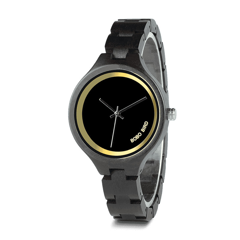 Minimalizmus a nadčasovosť. To sú slová, ktoré azda najpriliehavejšie vystihujú drevené hodinky Brittany – elegantný dámsky model, ktorý sa vyníma v našej ponuke a nepochybne priťahuje pozornosť svojím „glamour“ zjavom. Ich dizajnovo najvýraznejším prvkom je čierny ciferník so zlatými detailmi – kombinácia, ktorá je nesmrteľná a vždy bude symbolom noblesy. Čistý, priamočiary štýl je dosiahnutý hladkou plochou bez čísel – len ručičky sa kĺžu po čiernom kruhu v zlatej obruči, a práve to robí tieto hodinky neprehliadnuteľnými. Výnimočná je však aj kombinácia tohto žiarivého stredobodu s remienkom vyrobeným z dreva, ktoré kovový chlad vyvažuje svojím teplom a rustikálnosťou. Tieto dámske drevené hodinky tak v sebe spájajú dva prvky, ktoré spolu tvoria dokonalú symbiózu čistých línií a lesku s prírodným prvkom dreva. Kvalitné spracovanie a originálny štýl sú príznačné pre tieto drevené hodinky, dodávané s drevenou krabičkou. Je to dizajn, ktorý bude vždy aktuálny, vždy upúta nekonvenčnosťou a jasným, vyhraneným vzhľadom, ktorý nekompromisne potvrdzuje, že nositeľka týchto hodiniek má zmysel pre krásu a drobné, ale rozhodujúce detaily.